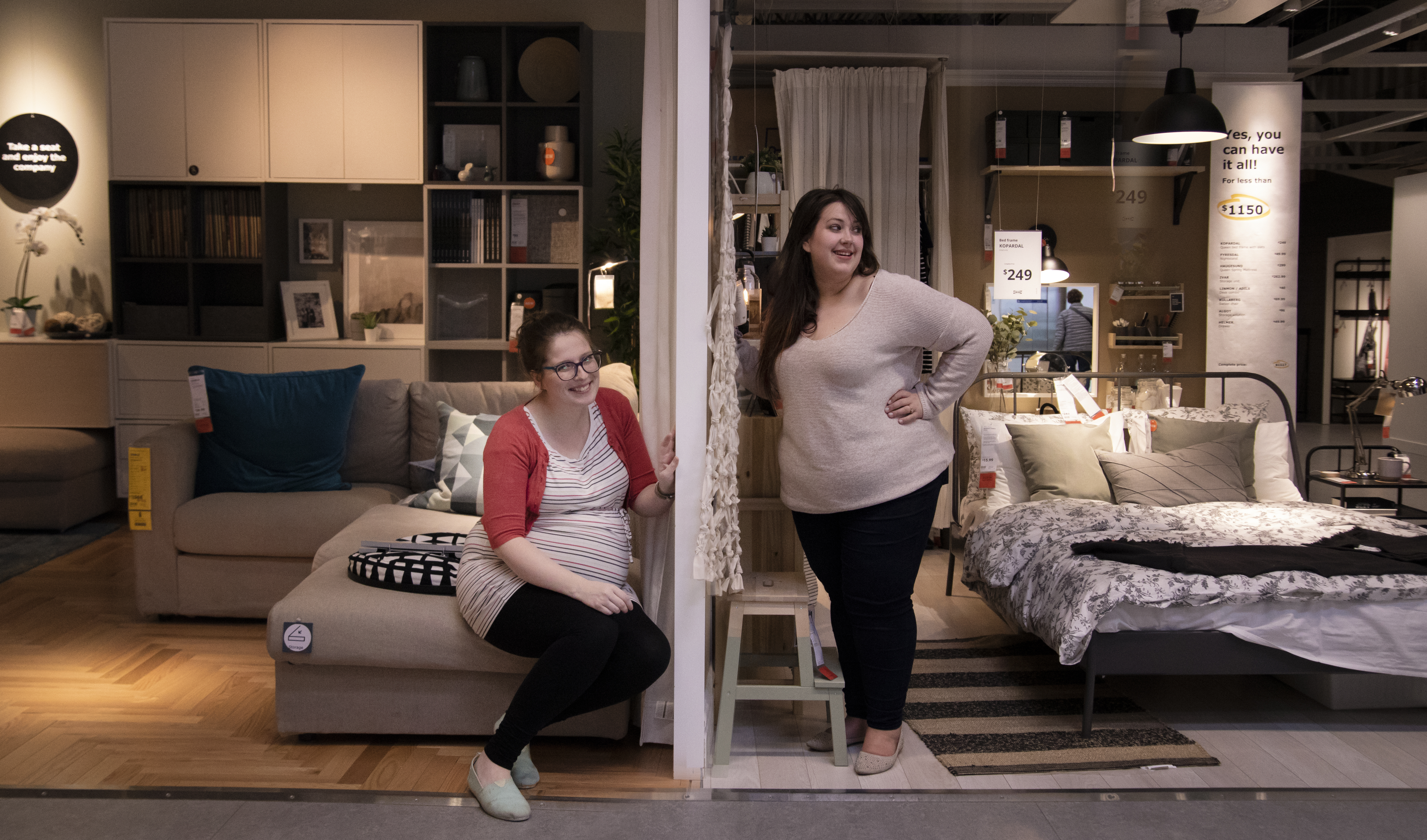 Yes, we could have gone the more traditional route of milk-bath photography, the silhouette look, the long flow-y gowns in the woods, but we got to thinking: wouldn’t it be a hoot to do a shoot in our favourite place – IKEA?! And so, after a 2 hour drive for Krystina to come down, me straightening my hair for the first time in 5 months (and then having Krystina re-straighten it), and figuring out how to wear make-up after a year of not bothering with even mascara, we were ready.