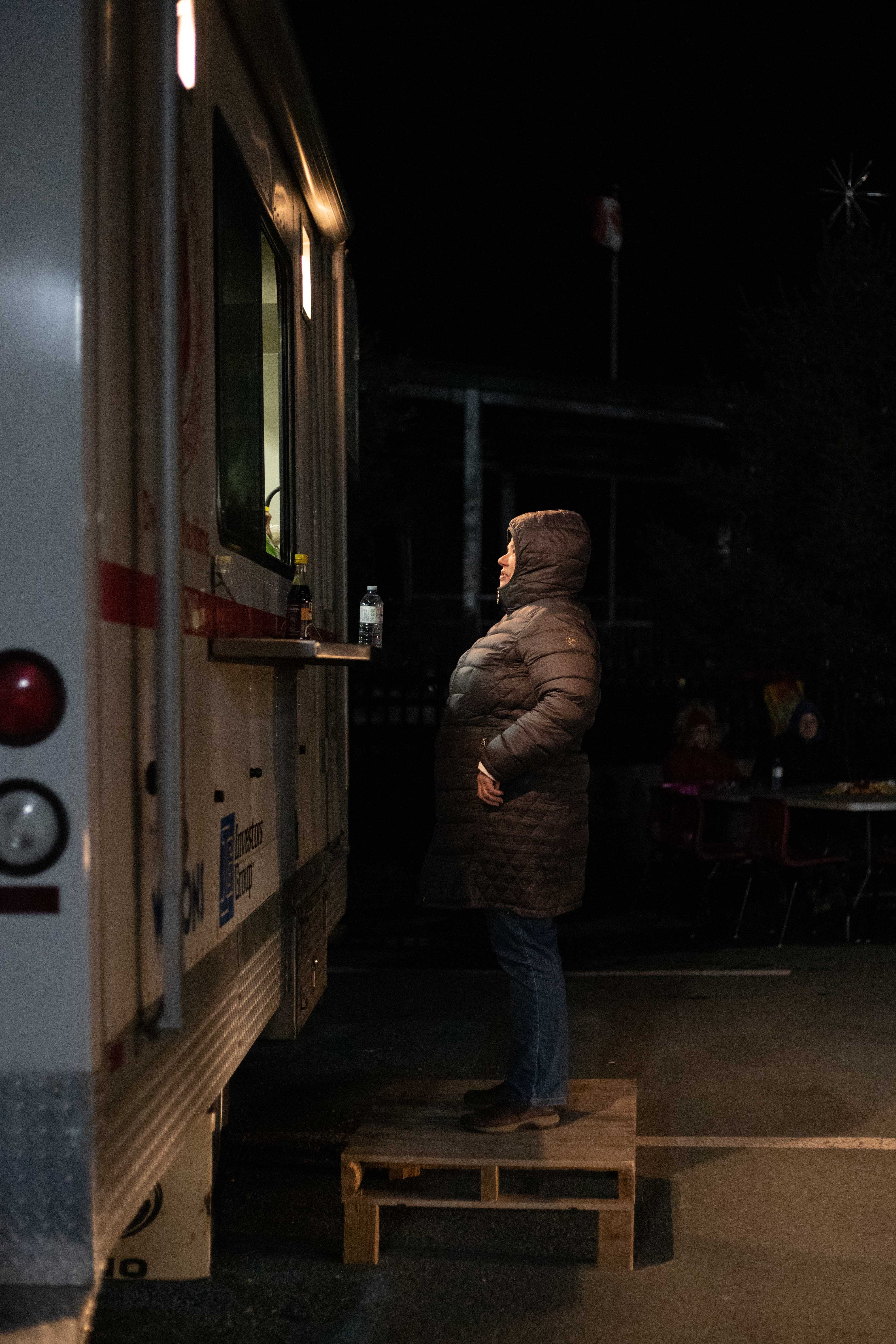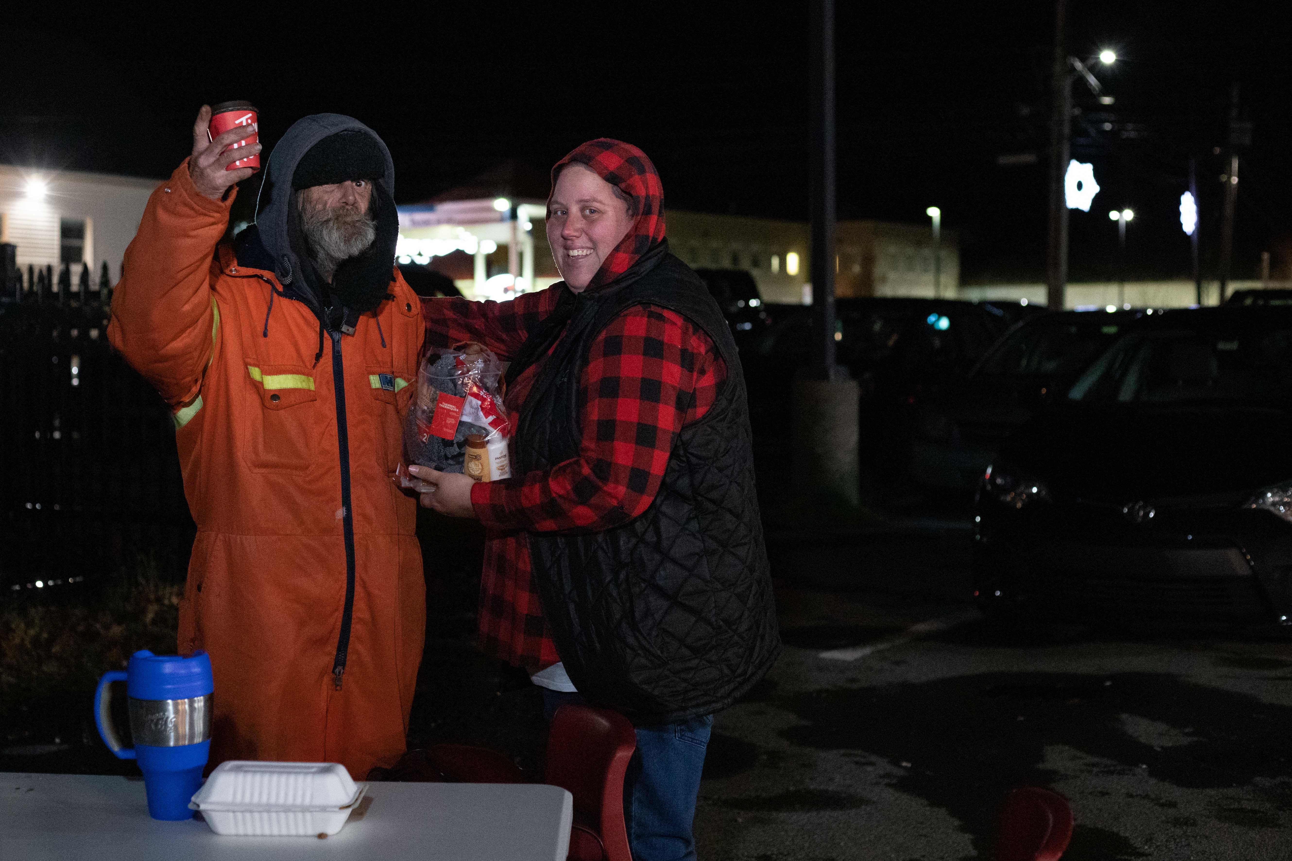 In just a couple short months, the initiative has grown. Not only do the volunteers serve food, but thanks to the latest addition to their caravan of giving, they are able to offer free clothing, blankets and winter wear from the Freedom Closet. Ready and willing to serve, the happy helpers wait with empty plastic bags to help their visitors get what they need. Anything from winter boots to sweaters to pet food line the shelves of the refurbished trailer, all absolutely free to whomever needs it! Last night (the first night the Freedom Closet was in operation), hundreds of items including sweaters, toiletries, and 154 winter jackets found new homes.