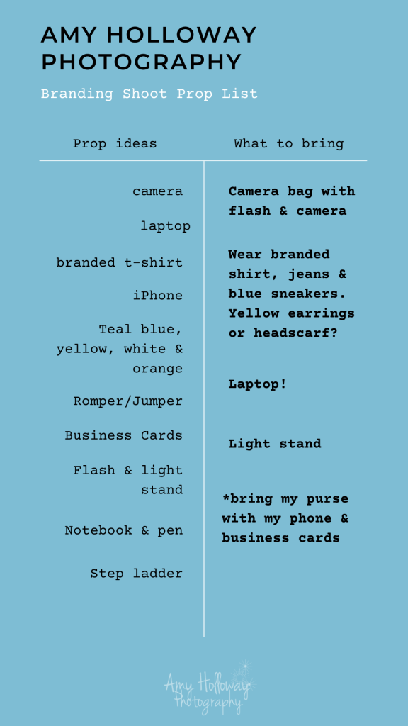 As you can see, not all of the items that were originally on my “Prop Ideas” list were included in my final decision of what to take along. That’s ok! I considered what could be condensed (like incorporating my brand colours and my branded t-shirt into my wardrobe for the shoot), what was key to me running my business (my camera & flash, laptop and light stand), and ensured that my personal items (like my phone, business cards, etc.) were with me in my purse.
